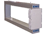 用于連續(xù)退火線或其它高溫的立式或水平爐內(nèi)帶鋼對中控制,耐溫最高可達(dá)1000℃,對中精度能達(dá)到±5mm。兩套耐高溫的套管中裝有特殊耐熱材料的磁感應(yīng)線圈,橫跨帶鋼上、下兩面。磁感應(yīng)線圈與信號處理單元之間的電纜出線端采用密封結(jié)構(gòu),以防爐內(nèi)氣體泄漏。根據(jù)所選用的對中位置傳感器,系統(tǒng)可用于檢測帶寬分別為450、1050或1450mm的對中偏移。